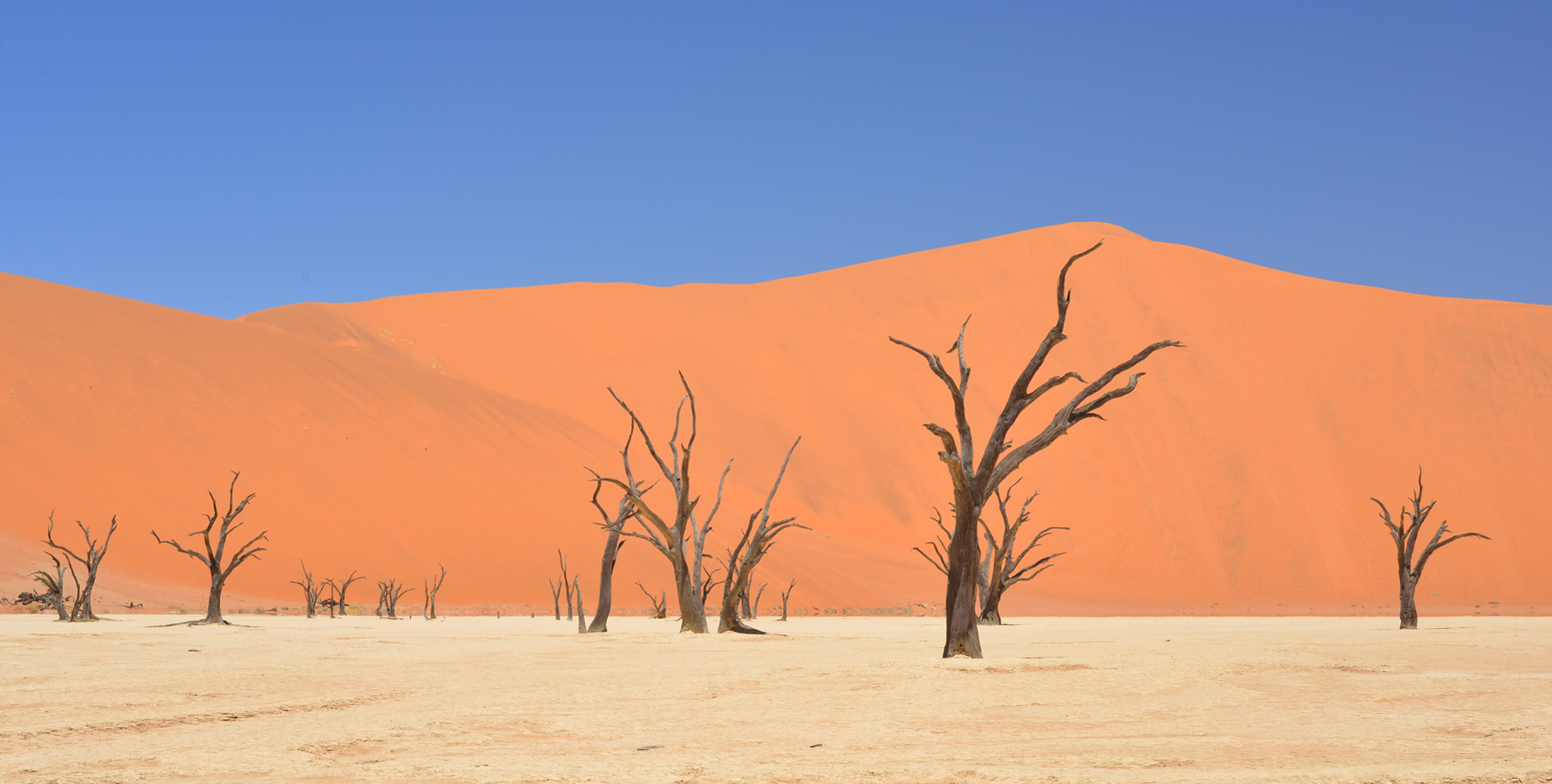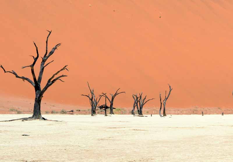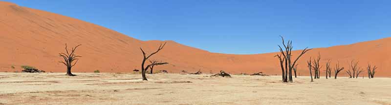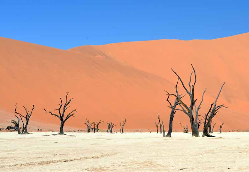 Wczesna pobudka na oglądanie wschodu słońca nad pustynią, spacer po wydmach z rozległym widokiem na resztę pustyni, w szczególności na bezodpływową nieckę Sossusvlei z dnem pokrytym kremowymi osadami iłu, całość otoczona malowniczymi, czerwonymi wydmami, co pod błękitnym niebem tworzy bodajże najpiękniejszy widok w całej Namibii! Jest to w gruncie rzeczy fascynujący obszar uschniętego jeziora pełnego minerałów i skamieniałych drzew, który co kilka lat zamienia się w tętniący życiem wodopój. Wydma 45, Big Daddy… Odpoczynek. Zachód słońca, kolacja. Nocleg w Sesriem.