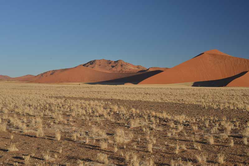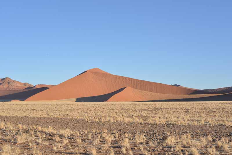 Poranny transfer na lotnisko, lot do Windhuk, stolicy Namibii, odprawa graniczna i przejazd 300 km na nocleg do osady Sesriem, u wrót Parku Narodowego Namib-Naukluft, gdzie znajdują się najwyższe na świecie (375m) wydmy o niezwykle harmonijnych, geometrycznych kształtach i wyostrzonych krawędziach, usypane z czerwonego piasku, zmieniające barwę w zależności od oświetlenia, ale też zmieniające kształt w zależności od siły wiatru.